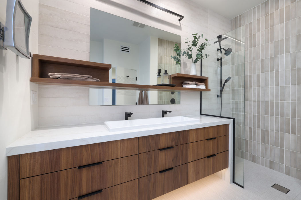 For the bathroom, the design shifts to Flat Cut Walnut cabinetry, introducing a richer, more dramatic aesthetic while maintaining a seamless flow throughout the home. This thoughtful material selection enhances the sense of luxury and comfort, making each space feel tailored, cohesive, and highly functional.